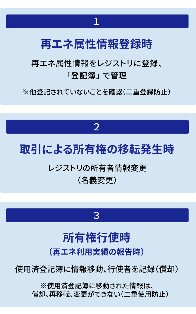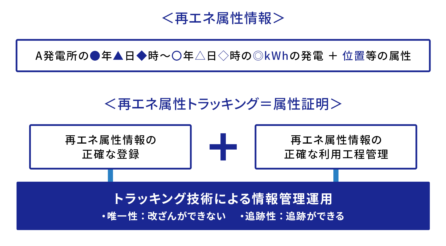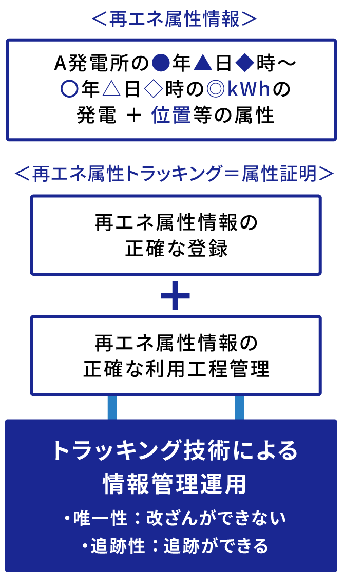 属性トラッキングでは、「どの発電所で、いつ、何kWh(キロワット時)の電力が発電されたか」という属性情報を記録するとともに、その属性情報に基づく電力の利用工程の情報を正確に運用管理します。つまり、改ざんできない「唯一性」と、履歴を後追いできる「追跡性」を有しているわけです。