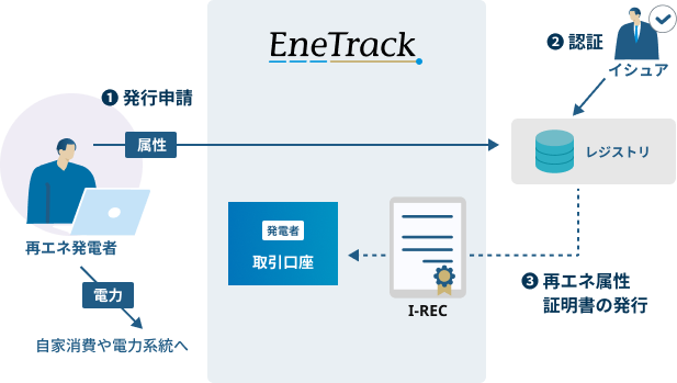 発行:再エネ発電者は、発電実績(発電期間や発電量など)をEneTrackからレジストリへ申請できる。申請後、イシュア(第三者認証機関)の認証を経て、EneTrack上の取引口座へ再エネ属性証書が発行・付与される。