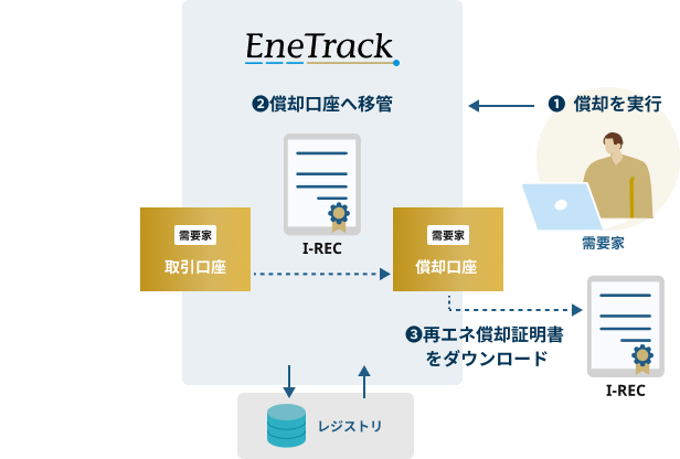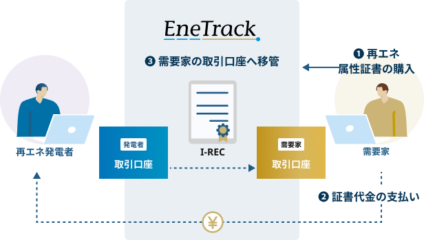 イメージしやすいように、I-RECの国内向け取引プラットフォーム「EneTrack」を利用した場合として解説する。