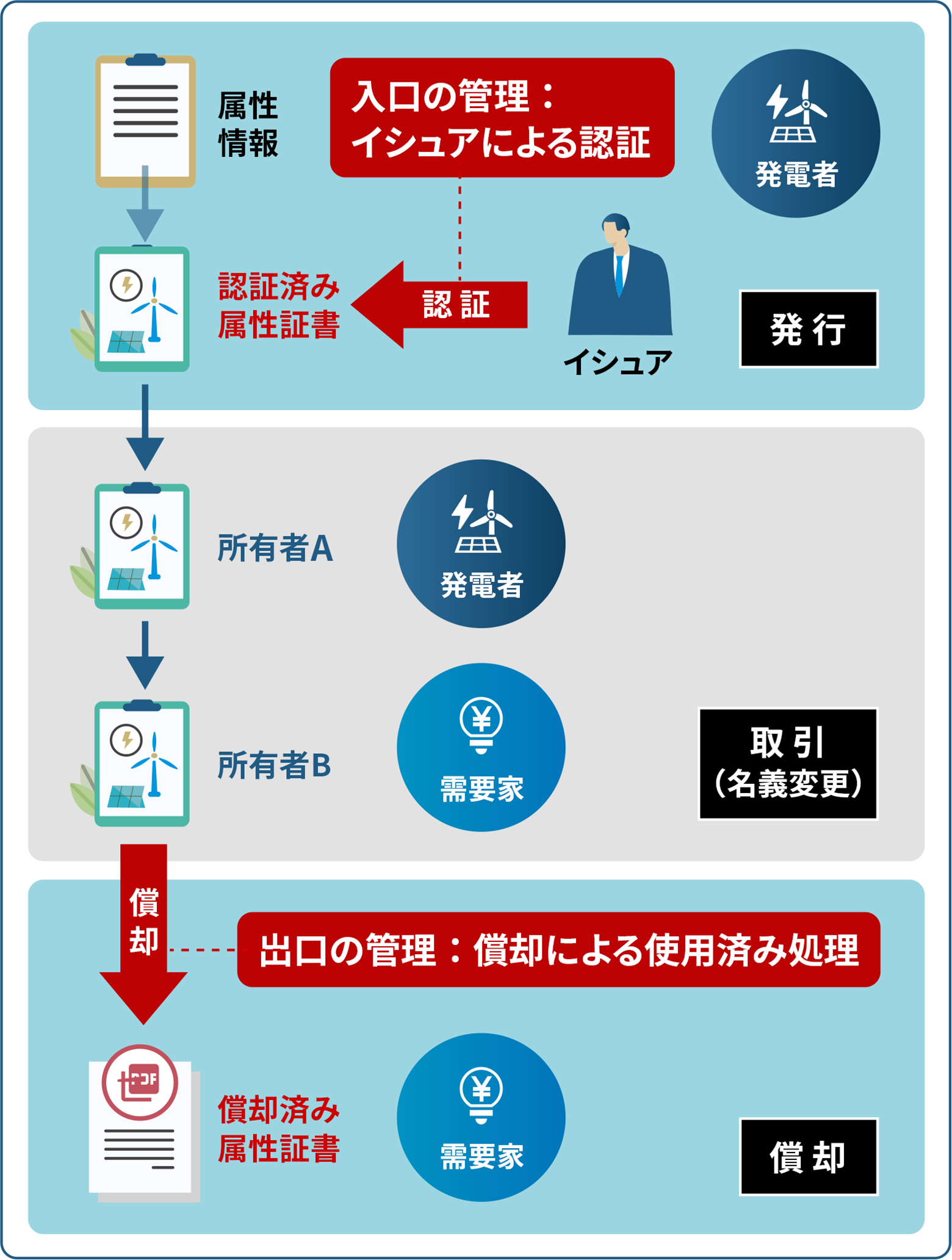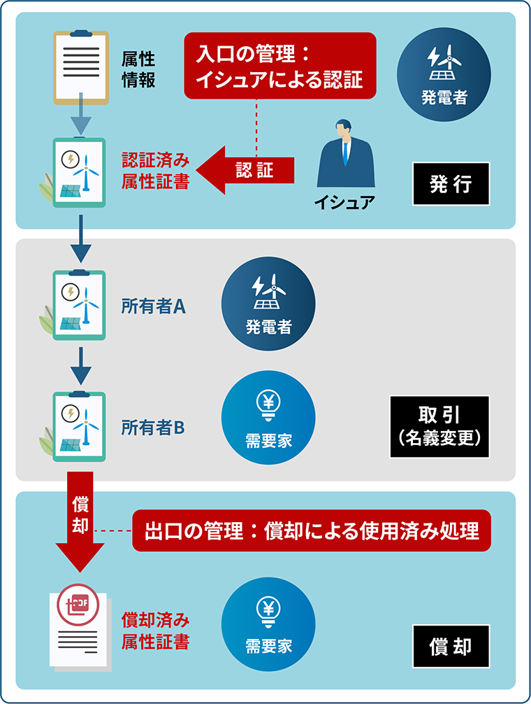 この入口の管理体制によって、同じ電力の属性証書(I-REC)が二重発行されることなく、間違いや不正を防止します。そして、第三者(イシュア)によって認証された属性証書(I-REC)だけが取引できる状態となるのです。