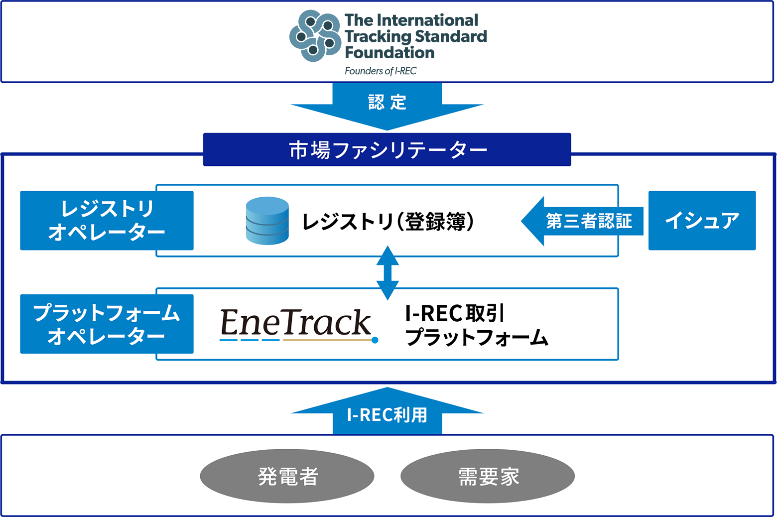 I-RECの管理体制には、登録された情報が正しいものかを確認し、I-RECの発行を許可する番人のような役割があります(この番人のことをイシュアと呼びます)。この番人が認証することでI-RECが発行され、属性証書として取引が可能になります。