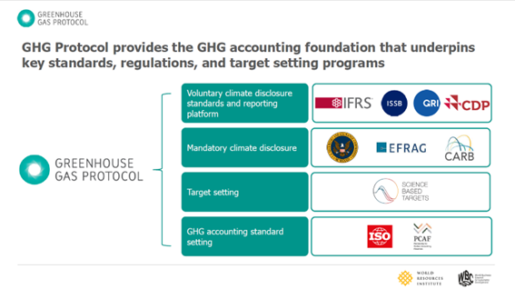 前述の通り、GHGプロトコルは、これまで主要なプログラムにおける温室効果ガス(GHG)算定の基準として広く位置づけられてきました。実際、多くの気候関連プログラムにおいて、その根幹をなす存在となっています。また、最近では非財務情報の開示が義務付けられるようになっているが、そういった開示規制も、GHGプロトコルを参照しています。